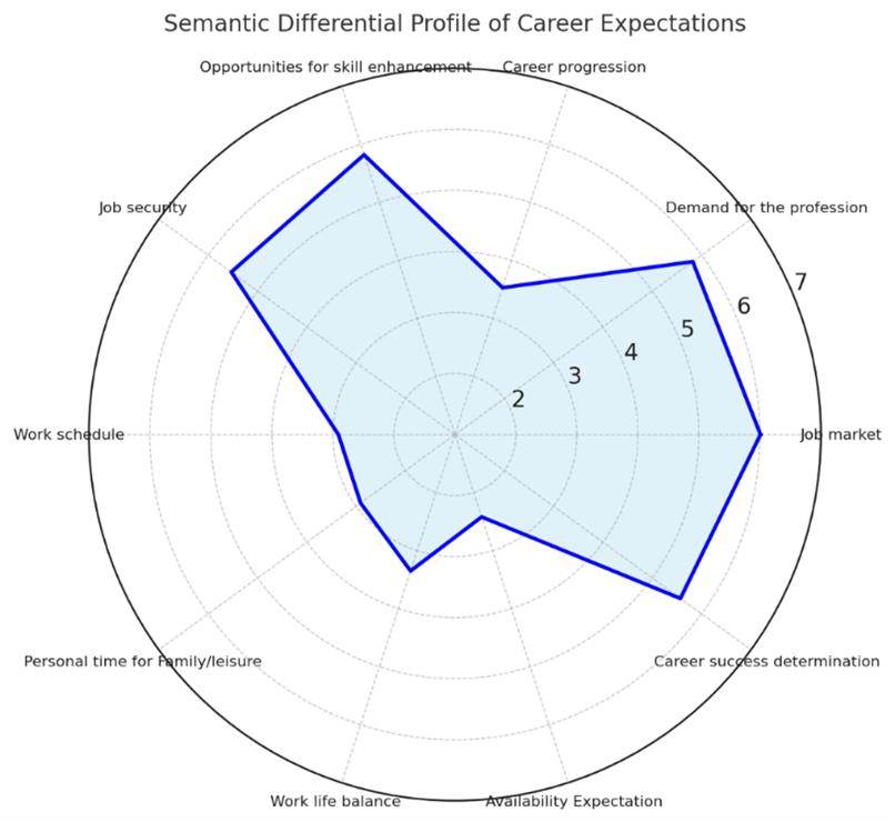 This study examines the semantic differences in career expectations among key stakeholders in the agricultural sector. Using a semantic differential scale, the research evaluates perceptions related to job opportunities, career progression, work-life balance, and job security. The findings indicated strong optimism regarding job market accessibility (M = 6.01), growing professional demand (M = 5.82), skill enhancement opportunities (M = 5.82), and job security (M = 5.53). Stakeholders also expressed confidence in the long-term viability of agricultural careers (career success determination, M = 5.57). However, concerns emerged around career progression clarity (M = 3.53) and work–life balance indicators, particularly work schedule (M = 2.91), personal time availability (M = 2.91), overall work–life balance (M = 3.35), and expectations of constant availability (M = 2.42). These results revealed a clear dichotomy, while employment prospects and professional stability appeared strong, work–life balance remained a critical constraint. Addressing these gaps through structured career pathways, workload rationalization, and supportive institutional policies is essential for aligning stakeholder expectations with real-world professional experiences. This will improve long-term satisfaction and retention in the agricultural sector. Addressing these concerns through targeted policy interventions and robust institutional support is vital to align stakeholder expectations with the lived experiences of agricultural professionals.