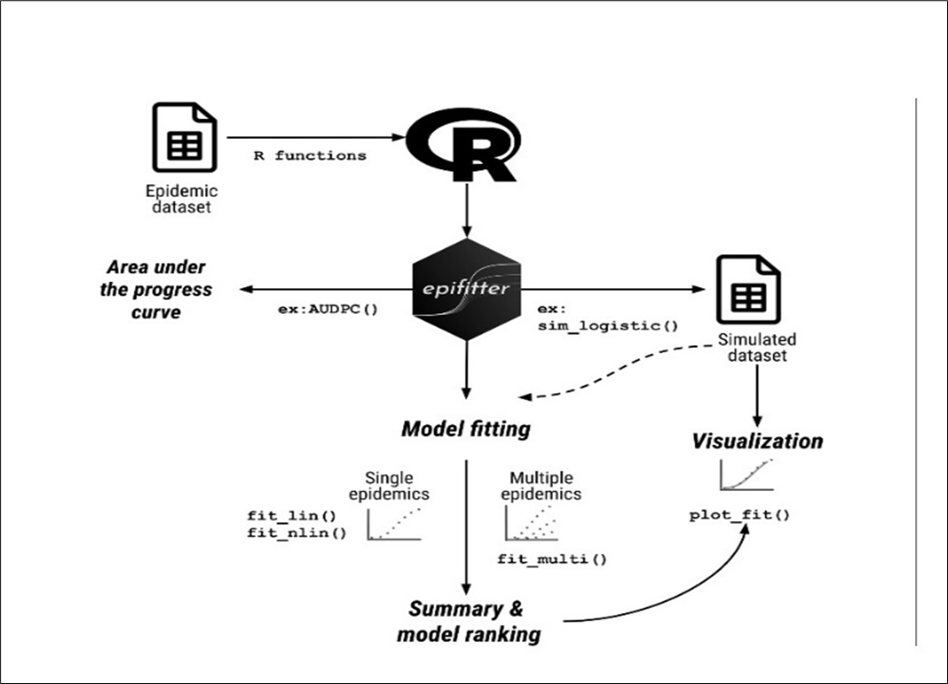 Once the epidemic dataset is collected, its imported in R studio and further analysis is done using the pre installed epifitter package. The built in functions for Model fitting (fit_lin, fit_nlin, and fit_nlin2) is used to fit the epidemic dataset into different statistical model to identify the best fit model that describes the overall epidemiological process. For making a simulated dataset of the disease severity rating with time, four functions (sim_logistic, sim_exponential, sim_monomolecular, sim_gompertz) specifically designed for the four statistical models are used. The further analysis and visualization can be done using the simulated dataset. For comparative study between different treatments and variables in the disease progression studies, a quantitative summary of the overall epidemiology can be understood using the Area Under Disease Progress Curves (AUDPC()), and its mathematical modification Area under Disease Progress Stairs (AUDPS()) function can be used. These two functions provide a quantitative summary on the disease progress (Alves and Del Ponte 2021). The complete analytical pipeline of the epifitter package- from data input to model fitting, visualization, and summary, is illustrated in Figure 10. This workflow diagram provides a structured overview of the package’s core functions and their sequential application in epidemic data analysis. A key limitation of the epifitter package is that its modelling accuracy depends on sufficiently detailed and regularly spaced epidemic observations, and the assumptions embedded in each growth model may reduce reliability when datasets are sparse, irregular, or highly variable.