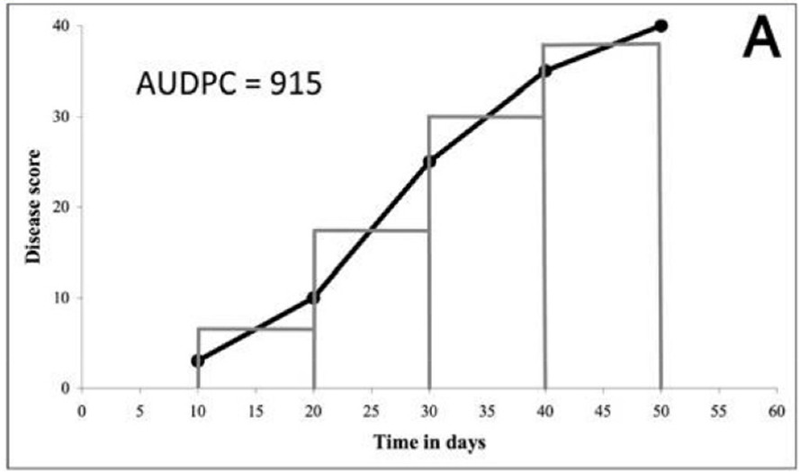The first observation typically indicates the initial level of disease, while the last observation reflects the final extent of the disease at the end of the assessment period. Both of these points are crucial for understanding the full trajectory of disease progression. If these observations are undervalued, the overall assessment may not accurately reflect the severity or impact of the disease over time. The AUDPS method addresses the limitations of AUDPC by giving greater weight to the first and last observations in a disease assessment, which are often undervalued in the AUDPC calculation. This improvement, which results in a better estimation of the overall impact of a disease over time, is particularly important in studies of plant-pathogen interactions, where understanding the full extent of disease progression is essential for effective management (Simko and Piepho 2012).