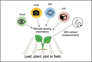 Disease assessment in crops is a fundamental component of plant pathology, serving as the basis for quantifying epidemic intensity, comparing treatments, evaluating host resistance, and developing reliable disease progress curves. Crop disease severity can be quantified through several methodological approaches that differ in precision, scalability, and practicality. Traditional visual assessment conducted by trained observers remains the most widely adopted technique due to its simplicity and suitability for field conditions; however, it is inherently subjective and susceptible to assessor bias, even when standardized scales are used (Nutter Jr and Schultz 1995; Bock et al. 2010). Advancements in imaging technologies have enabled the development of remote sensing-based assessment methods, including RGB imaging, multispectral imaging (MSI), and hyperspectral imaging (HSI), which significantly enhance objectivity and consistency. RGB cameras capture high-resolution colour imagery suitable for detecting visual symptoms, while MSI records reflectance in selected spectral bands associated with plant physiological responses and stress. HSI, providing detailed spectral signatures across numerous contiguous wavelengths, supports early detection of subtle biochemical and structural changes preceding visible symptom expression (Mahlein 2016; Mahlein et al. 2018). In addition to imaging-based approaches, contact-based measurement methods-such as manual lesion counting, digital area measurement tools, planimetry, and laboratory-based quantification of pathogen biomass using qPCR or ELISA-offer high accuracy but are often labour-intensive and time-consuming (Bock et al. 2010; Mutka and Bart 2015). Collectively, these methods form a continuum from simple field-based visual scoring to advanced sensor-driven analytics, allowing researchers to select the most appropriate approach based on the scale, objectives, and precision requirements of disease monitoring in agricultural systems (Del Ponte 2023). These diverse approaches to disease quantification—from visual scoring to advanced spectral imaging and contact-based measurements—are conceptually illustrated in Figure 2, which categorizes remote sensing and direct measurement techniques based on their mode of interaction with plant material.