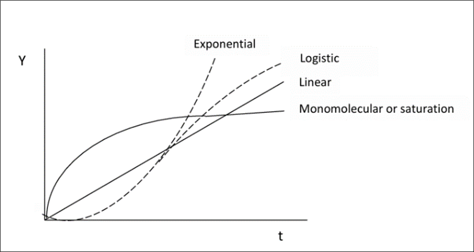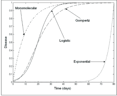 Mathematical models can be utilized to analyze DPC (Disease Progression Curve) data, enabling the expression of epidemic advancement in terms of rates and absolute or relative quantities. This approach involves employing population dynamics, or growth-curve, models, for which the estimated parameters typically hold biological significance and effectively depict epidemics that do not exhibit a decline in disease intensity (Savary and Willocquet 2020). The diversity in mathematical modeling approaches for disease progression is illustrated in Figure 8, which compares four commonly used growth-curve models and their respective trajectories over time. By fitting a suitable model to the progression curve data, researchers gain access to a distinct set of parameters, facilitating the representation, comprehension, and comparison of epidemics. The definition of an epidemic can be expressed in terms of dy/dt, where y represents disease severity or incidence and t represents time. The term dy/dt signifies the absolute rate of disease increase or absolute growth rate. Quantifying epidemics involves expressing dy/dt as a function of y, t, or other relevant variables (Madden, Hughes, and Van den Bosch 2007).
