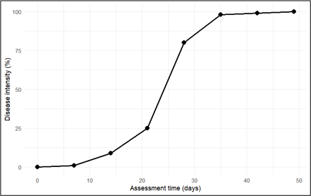 The disease progress curve illustrated in Figure 4 was generated using a model dataset representing disease severity recorded across successive time points (days). The visualization was produced using the R statistical computing environment (RStudio), which enabled the construction of a representative epidemic trajectory for demonstrating typical patterns of temporal disease development.