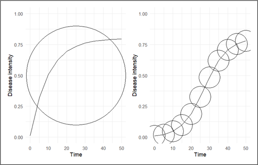 The main goal of epidemiological research is to comprehend the correlation between disease patterns and external influences. The progression of a disease over time can be represented through appropriate models, often depicted as curves. Enhanced understanding can facilitate the creation of more effective, sustainable, and efficient management strategies to mitigate the impact of diseases on crop yield. The relationship between epidemic development and crop yield loss can be more accurately quantified by integrating disease progress with the timing of infection events. Traditional methods often rely solely on final disease severity or cumulative disease intensity; however, the timing of pathogen establishment has a critical influence on the final yield outcome. The framework proposed by the 1998 study on coupling disease-progress curves with time-of-infection functions demonstrated that early infections disproportionately reduce yield because they allow more time for pathogen colonization and physiological disruption of host tissues (Madden, Hughes, and Irwin 2000).