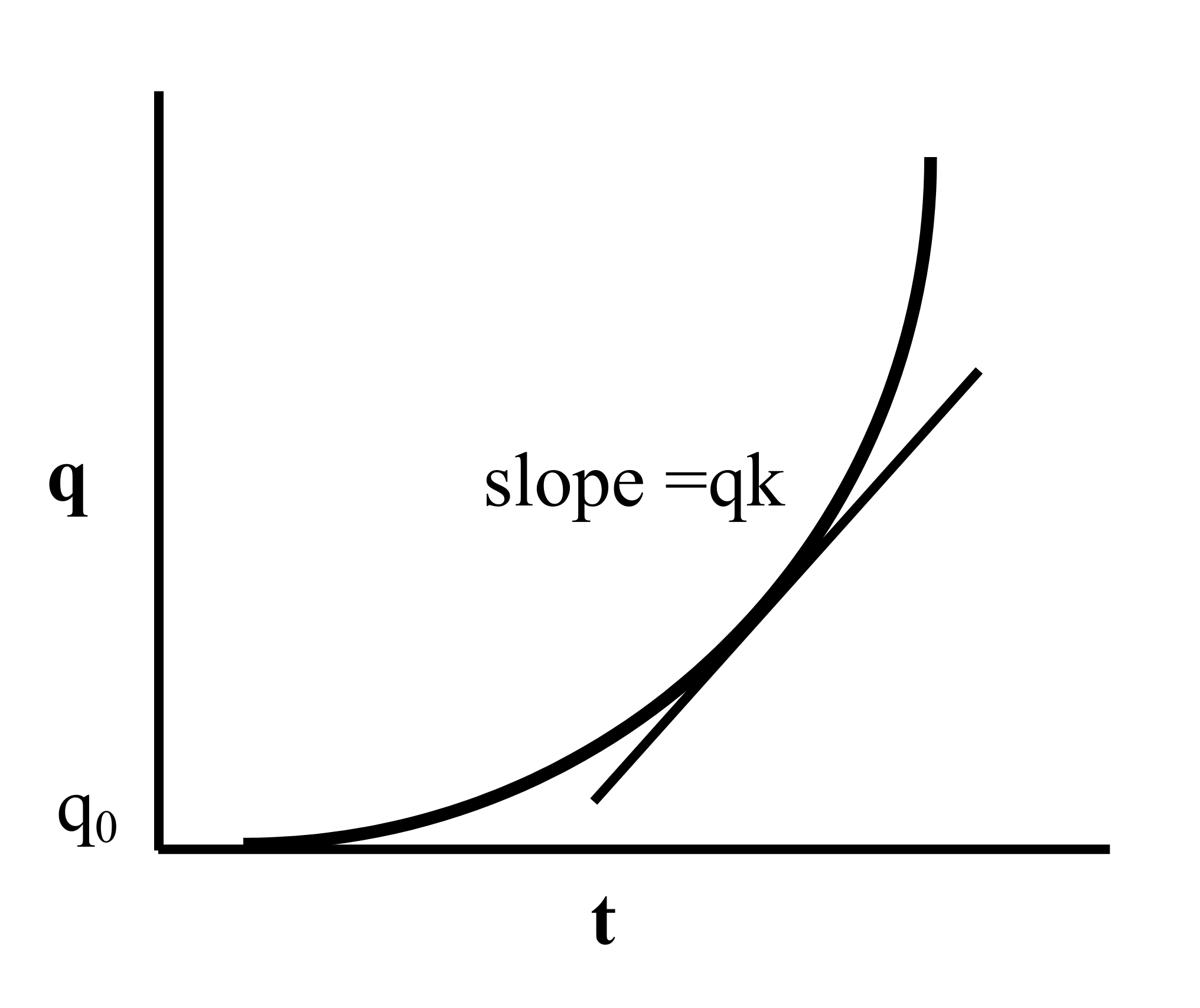 The given expression is analogous to an exponential function, with q0 representing the initial inoculum, and e as the base of the natural logarithm. The instantaneous rate of change in q is denoted by dq/dt, which signifies the slope of the tangent to the curve at any given point (Figure 7).